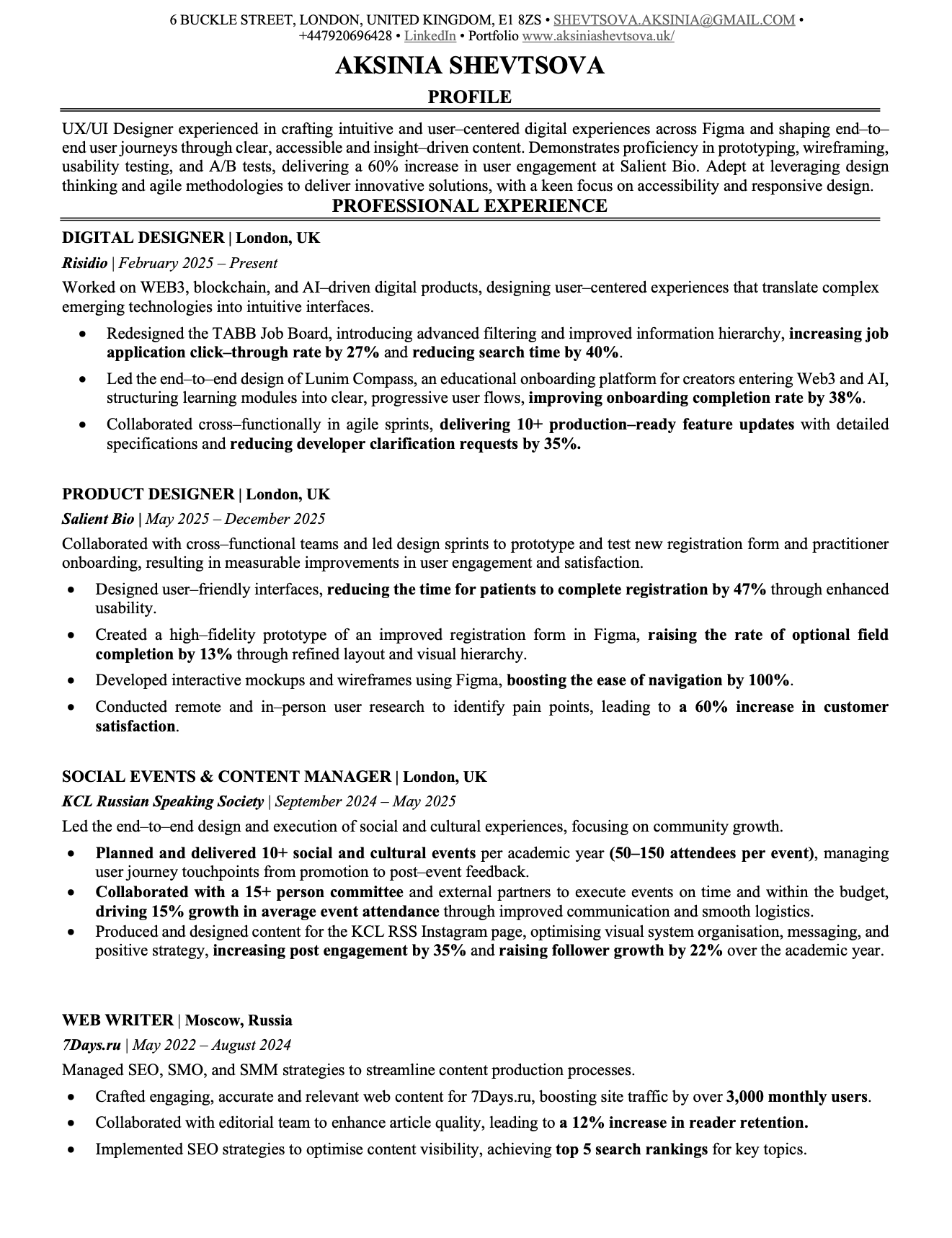 CV Contact me if you wish to get in touch Emailshevtsova.aksinia@gmail.com Phone+44 7920696428 Let's Work Together You can also find me online